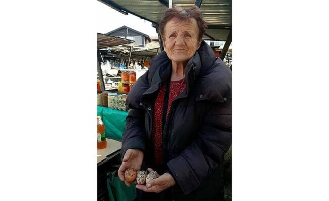 – Ово су домаћа, нашарана јаја. Носе их моје коке које иду по дворишту, концентрата нема, сто одсто. Шарам јаја, али тек увече када позавршавам све послове, онда се тиме бавим. Купују људи, неки додуше само запиткују, а цена је 60 динара – каже она док муштерији показује робу.